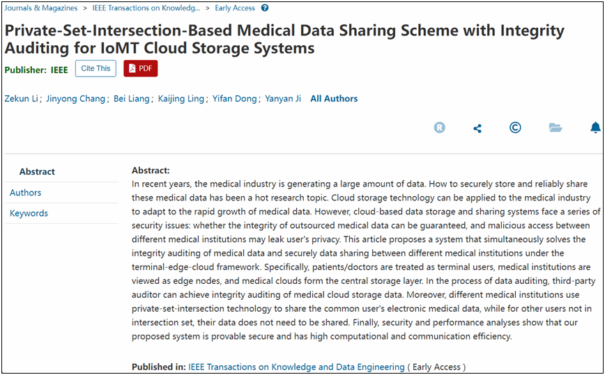 常金勇教授团队在国际顶级期刊IEEE TKDE(中国科茄子视频SCI一区Top, 中国计算机学会和中国人工智能学会共同推荐的A类期刊,影响因子10.4)上发表题为“Private-Set-Intersection-Based Medical Data Sharing Scheme with Integrity Auditing for IoMT Cloud Storage Systems”(云存储环境下基于隐私集合求交的医疗数据共享与完整性审计方案)的学术论文。论文第一作者为茄子视频